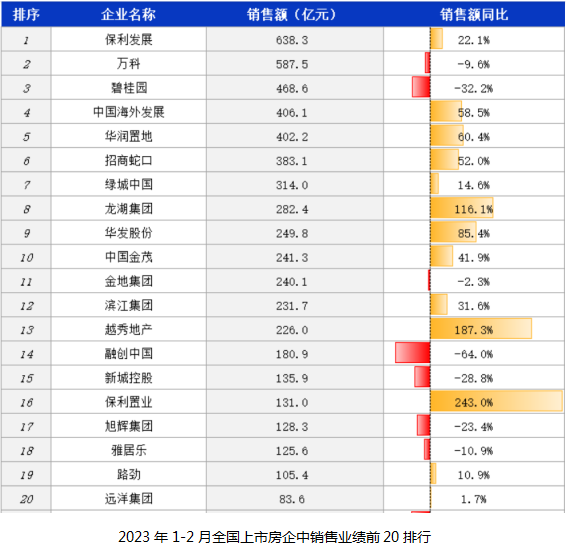 头条地产根据3月17日诸葛找房的统计数据中发现,2023年1-2月50家重点上市房企销售金额为6724.6亿元,销售在300亿元以上的同比去年新增了7家,分别为:保利发展、万科、碧桂园、中国海外发展、华润置地、招商蛇口和绿地中国。