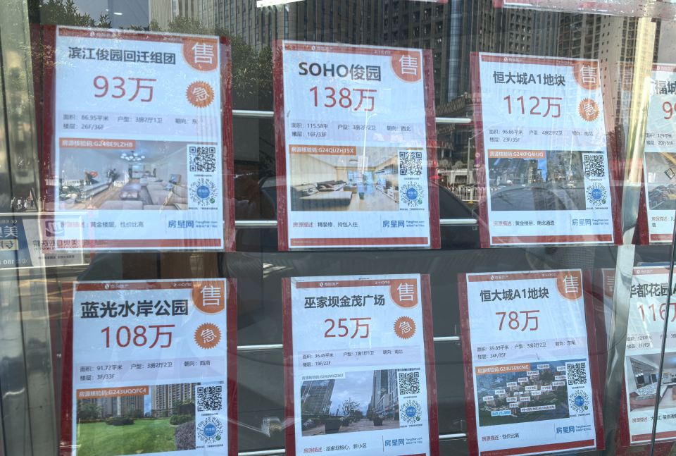 在西山区前兴路时代风华二期某经纪机构门店,其门店的玻璃橱窗上张贴了10余张对外出售的二手房房源信息海报